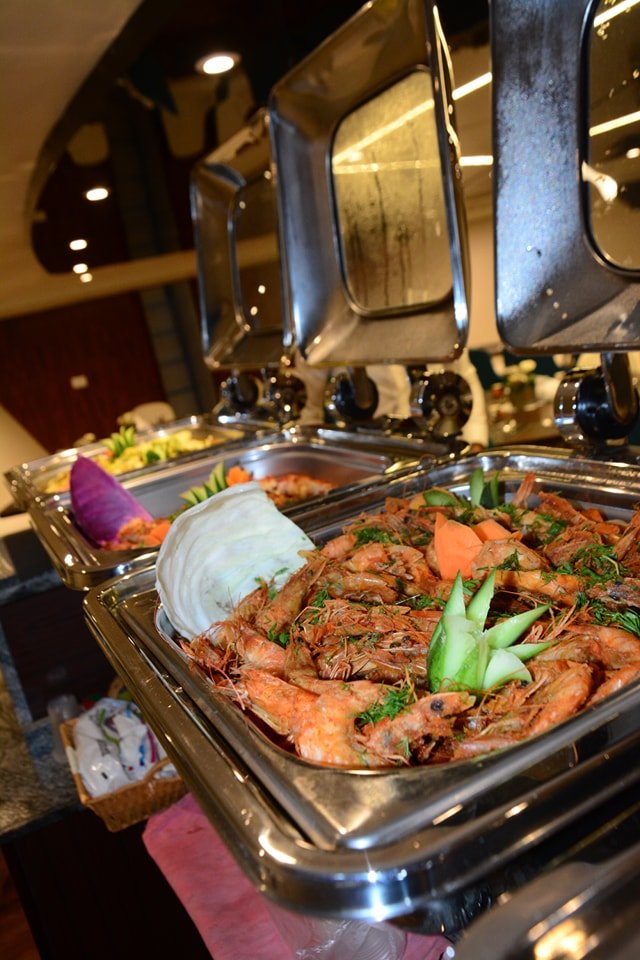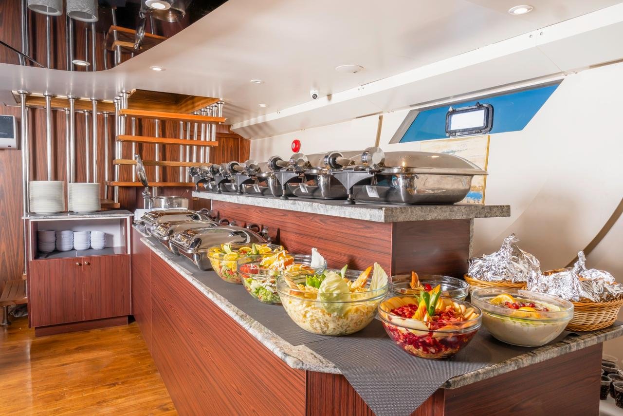 На борту вас ждёт изысканный ужин: свежие морепродукты, салаты, фрукты и прохладительные напитки, в уютной атмосфере под приятную музыку и мерцающий свет заката.
