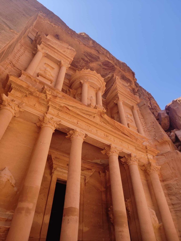 Petra to jedno z najbardziej wyjątkowych miejsc starożytnego świata — miasto wykute bezpośrednio w różowo-czerwonych skałach. Ze względu na kolor kamienia często nazywana jest „Różowym Miastem”. Dawniej była stolicą Nabatejczyków — ludu, który dzięki handlowi, zaawansowanej inżynierii i niezwykłej architekturze stworzył potężne państwo pośród pustyni.