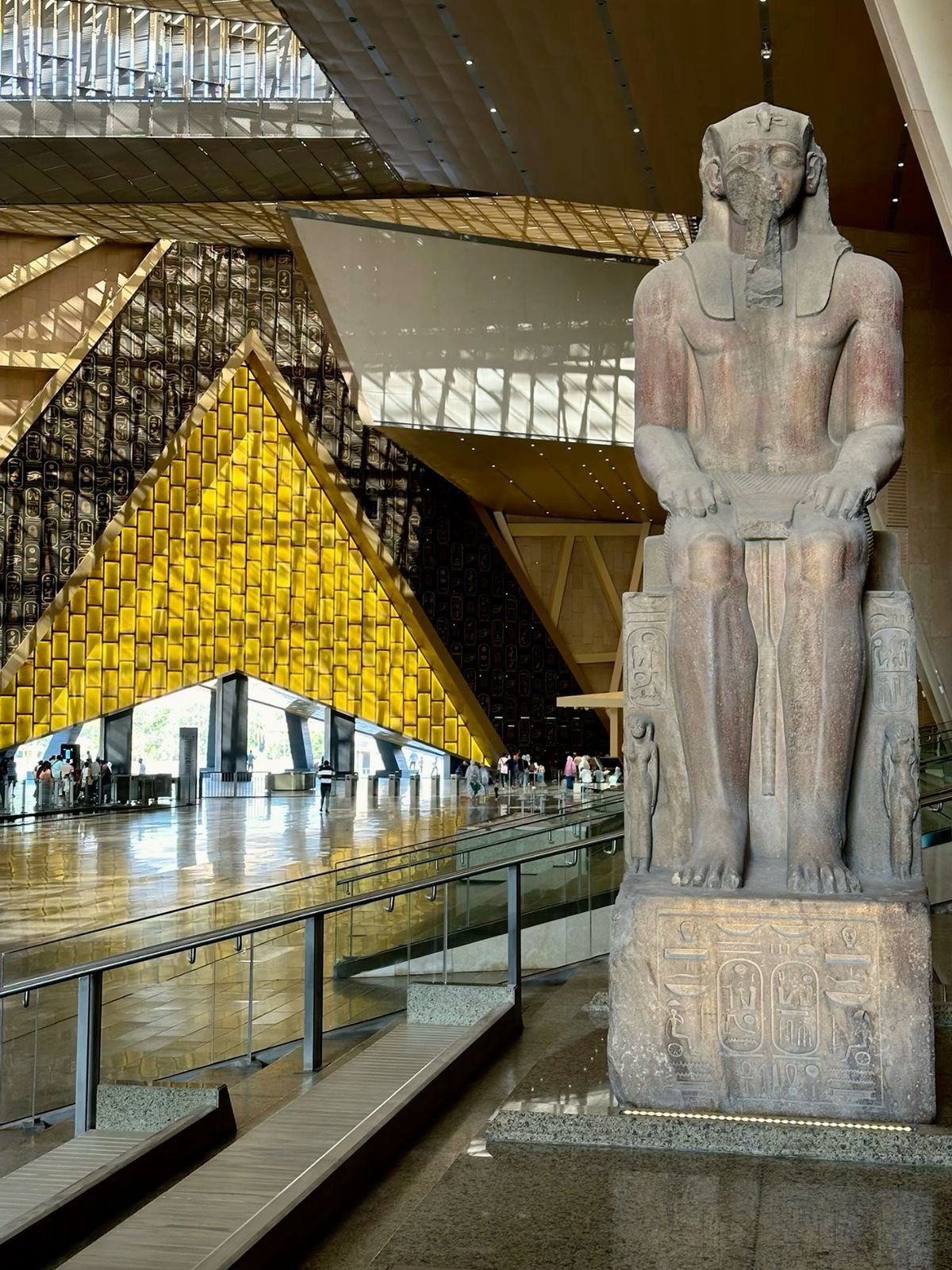 W monumentalnym holu głównym gości wita 11-metrowy posąg Ramzesa II, a z przeszklonych przestrzeni muzeum rozciąga się wyjątkowy widok na piramidy w Gizie.